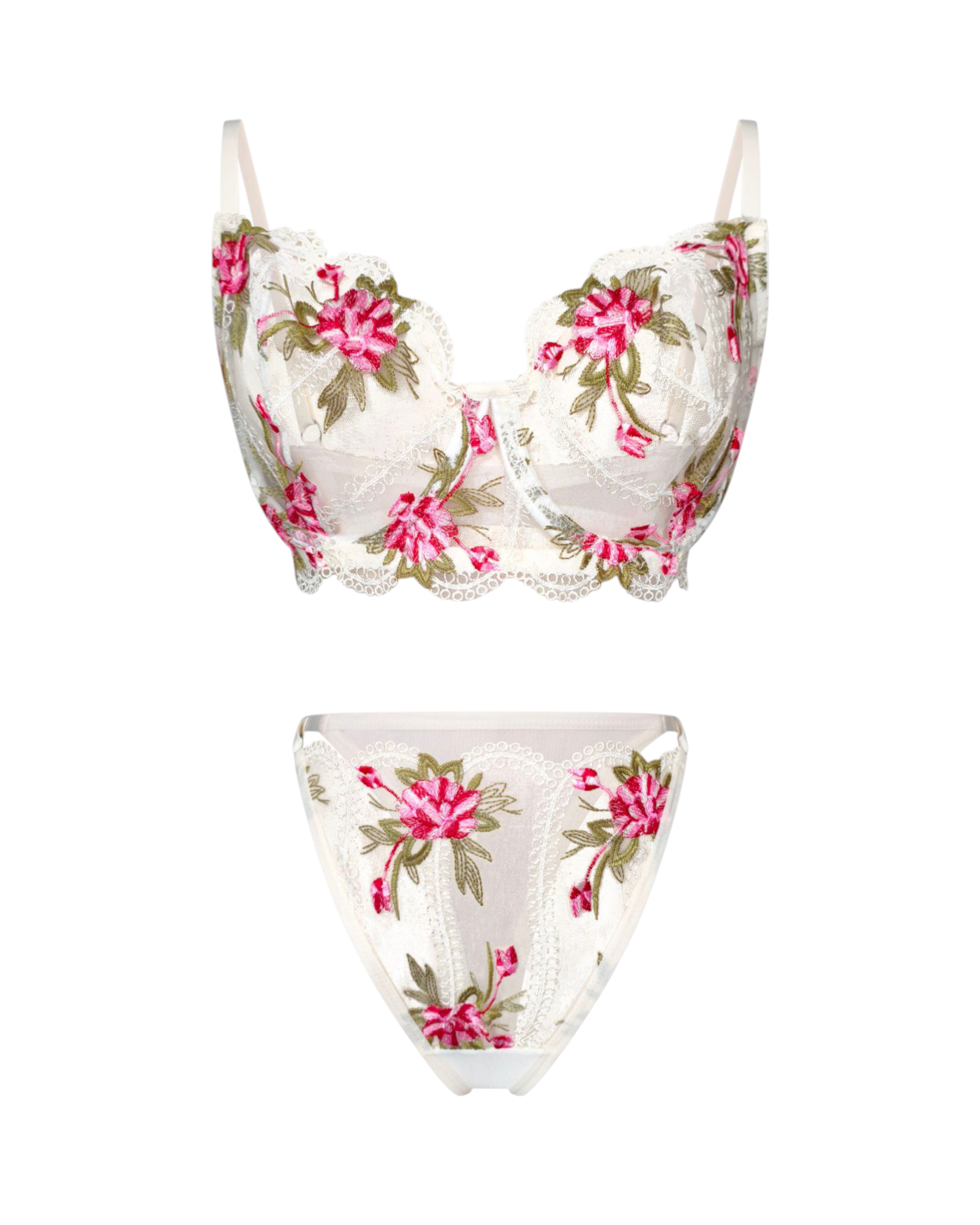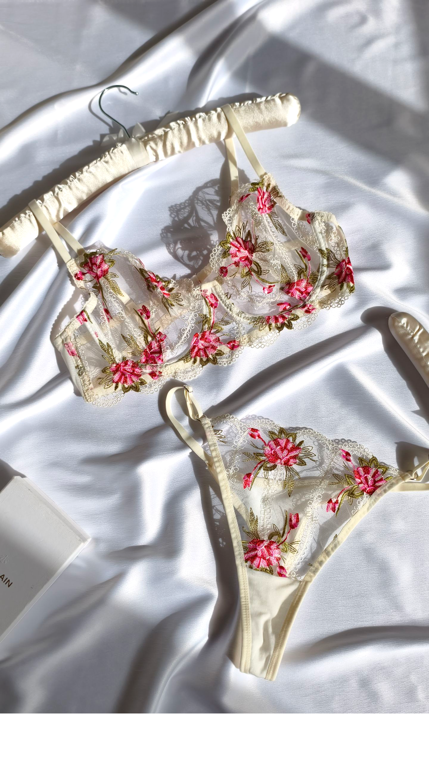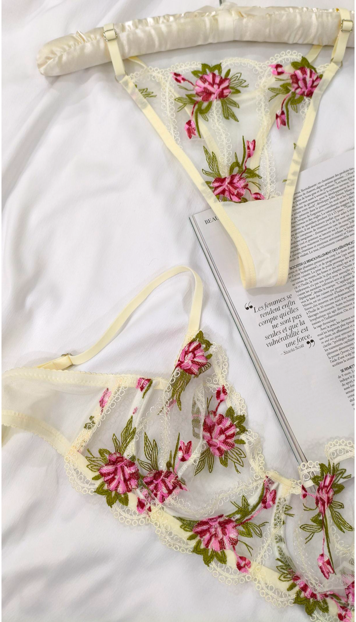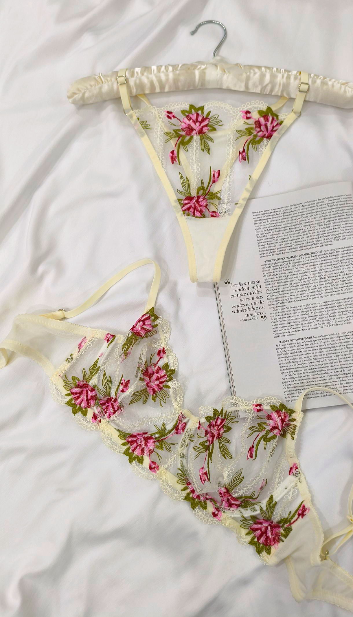 Un ensemble à la légèreté très évocatrice, sa dentelle florissante n'est pas sans rappeler les étés chauds, la flore aux bord des plages sauvages d'Antalya.