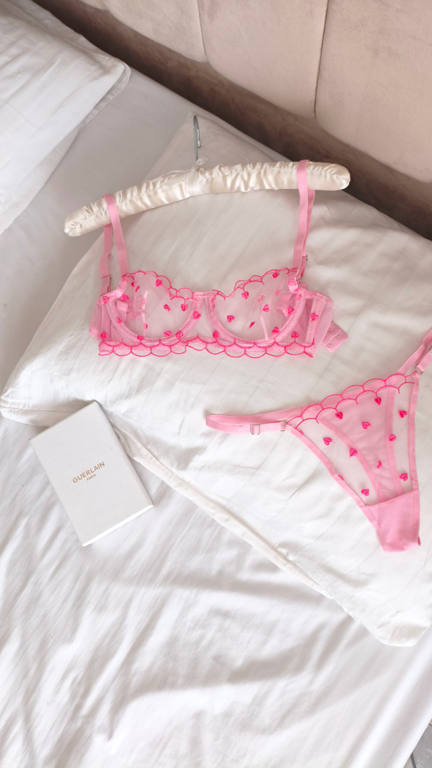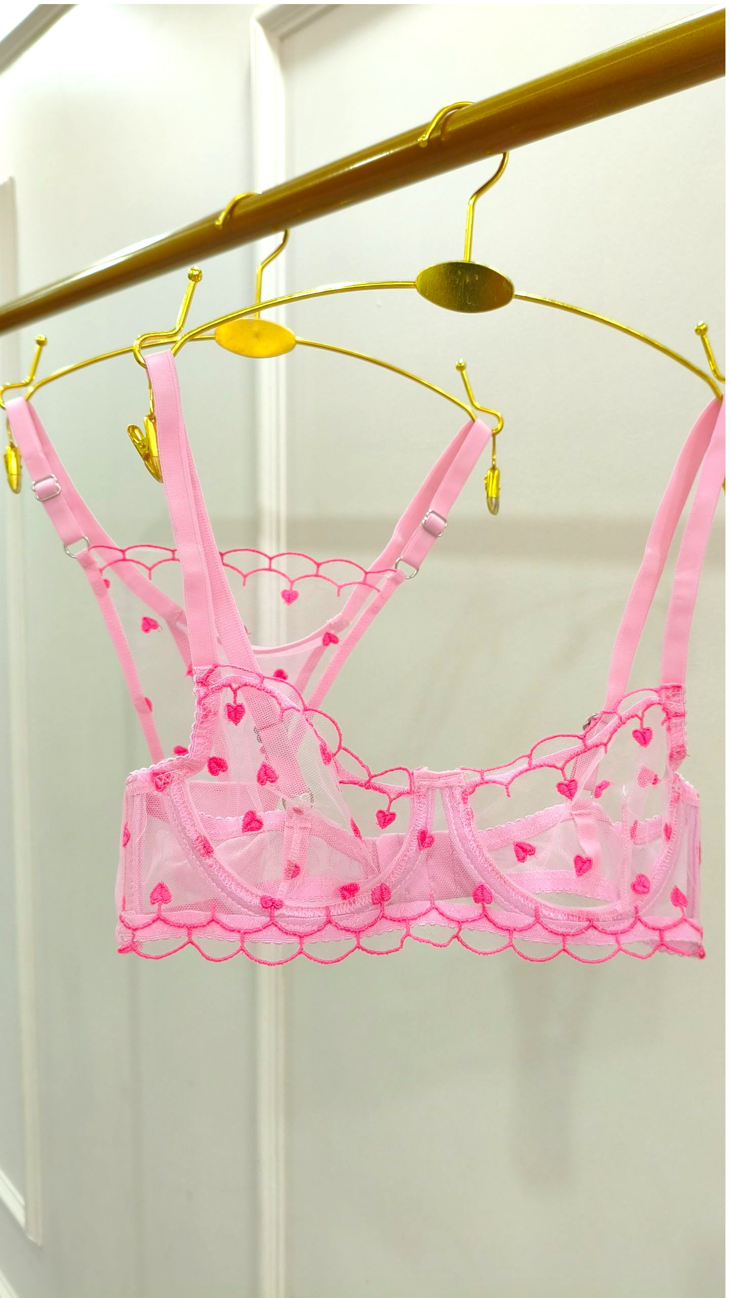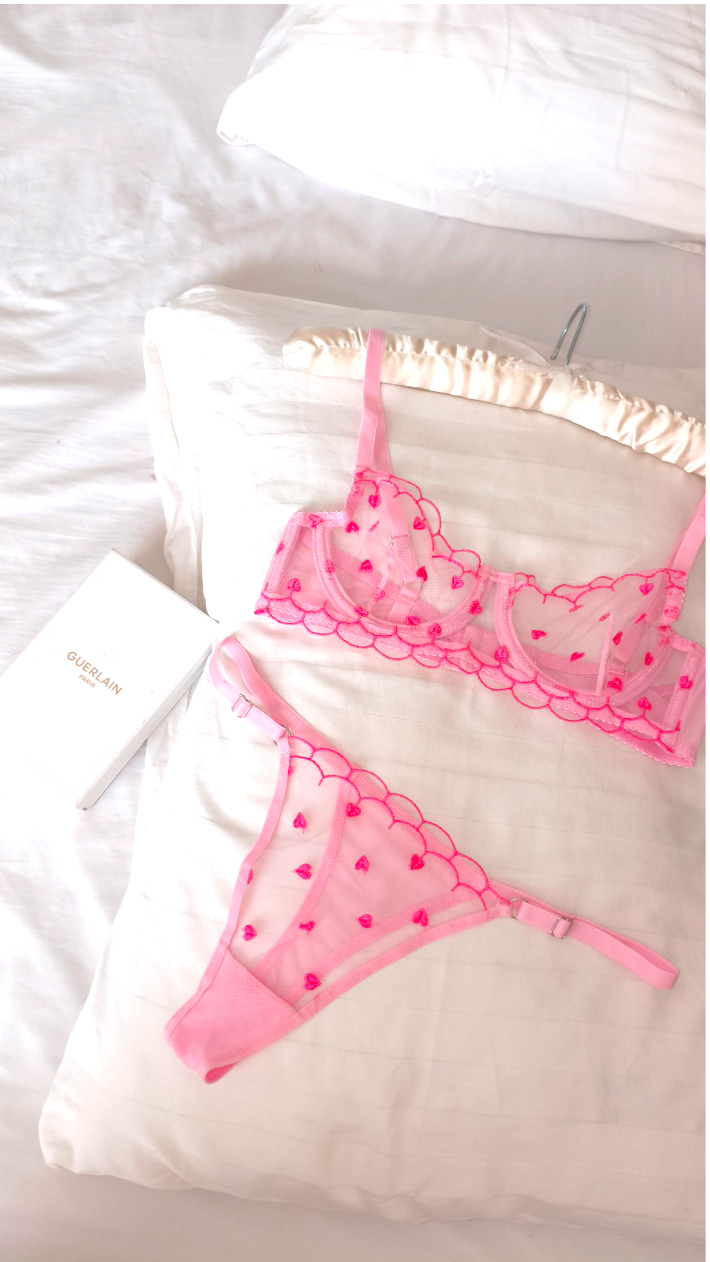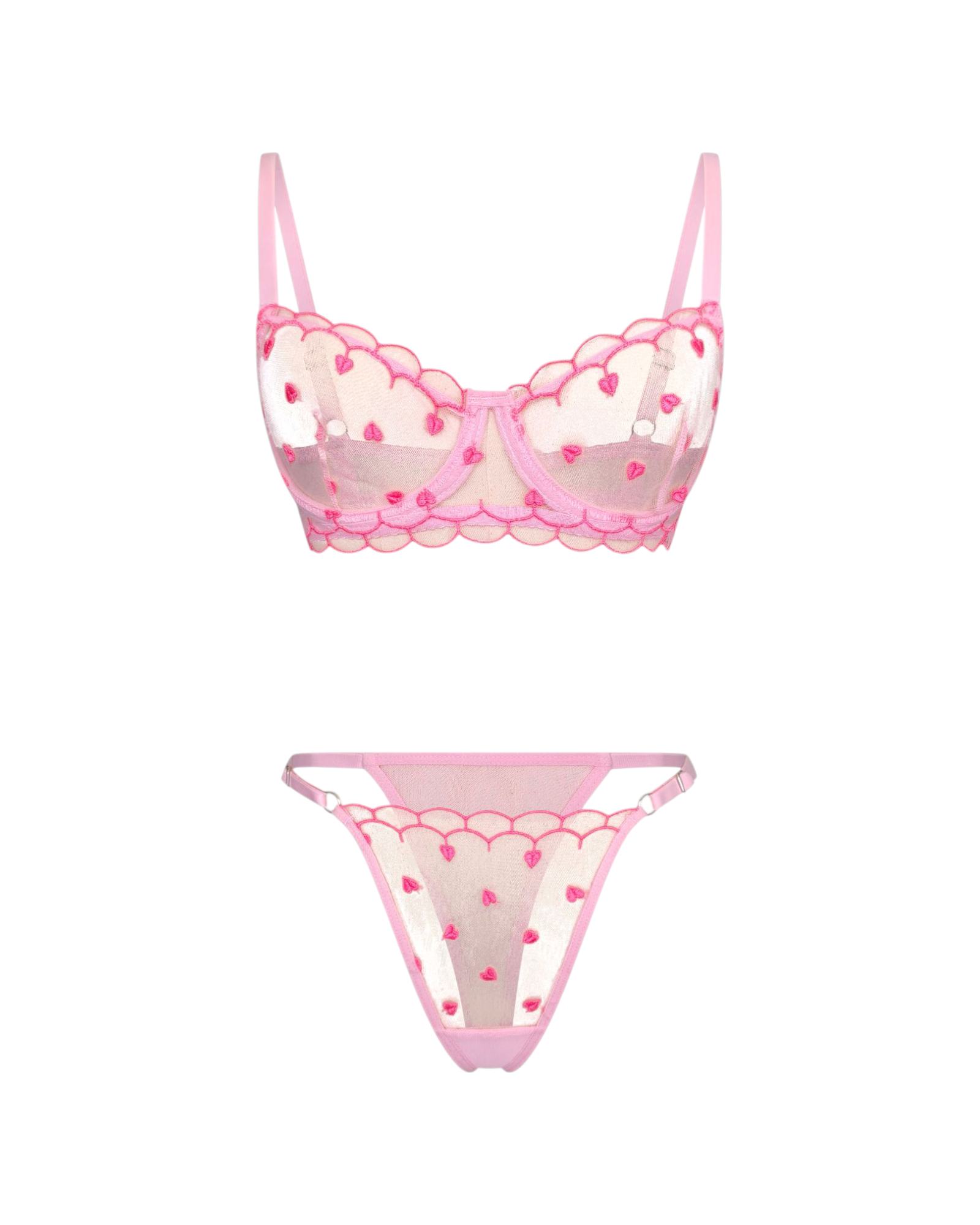 Doté d'un soutien-gorge balconnet au tulle délicatement parsemé de petits coeurs brodés alliant romantisme et transparence suggestive, cet ensemble est un véritable ode à l'amour.