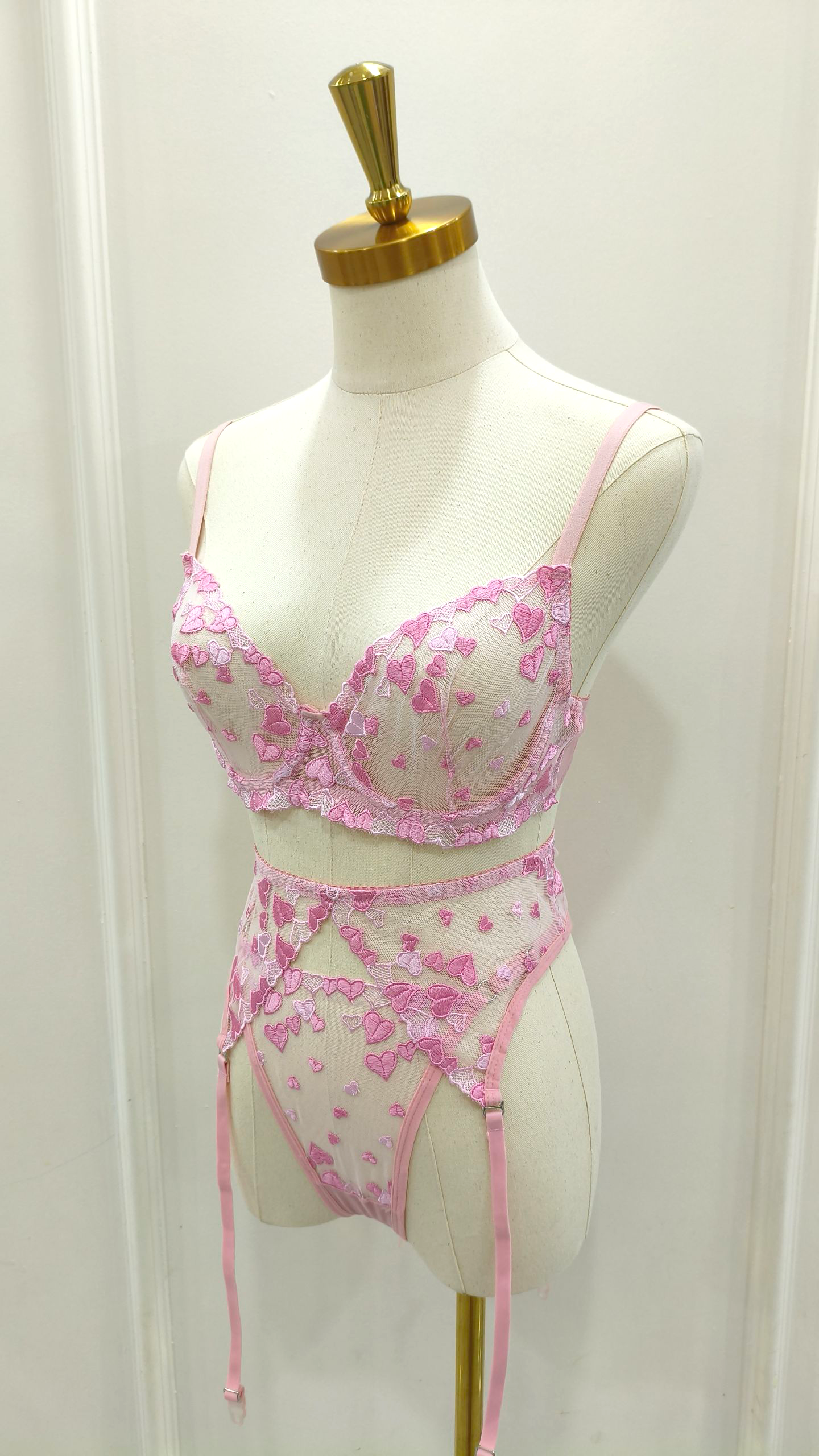L'ensemble est composé d'un soutien gorge de sa culotte brésilienne ainsi que de son porte jarretelles assorti, réglables par bretelles.