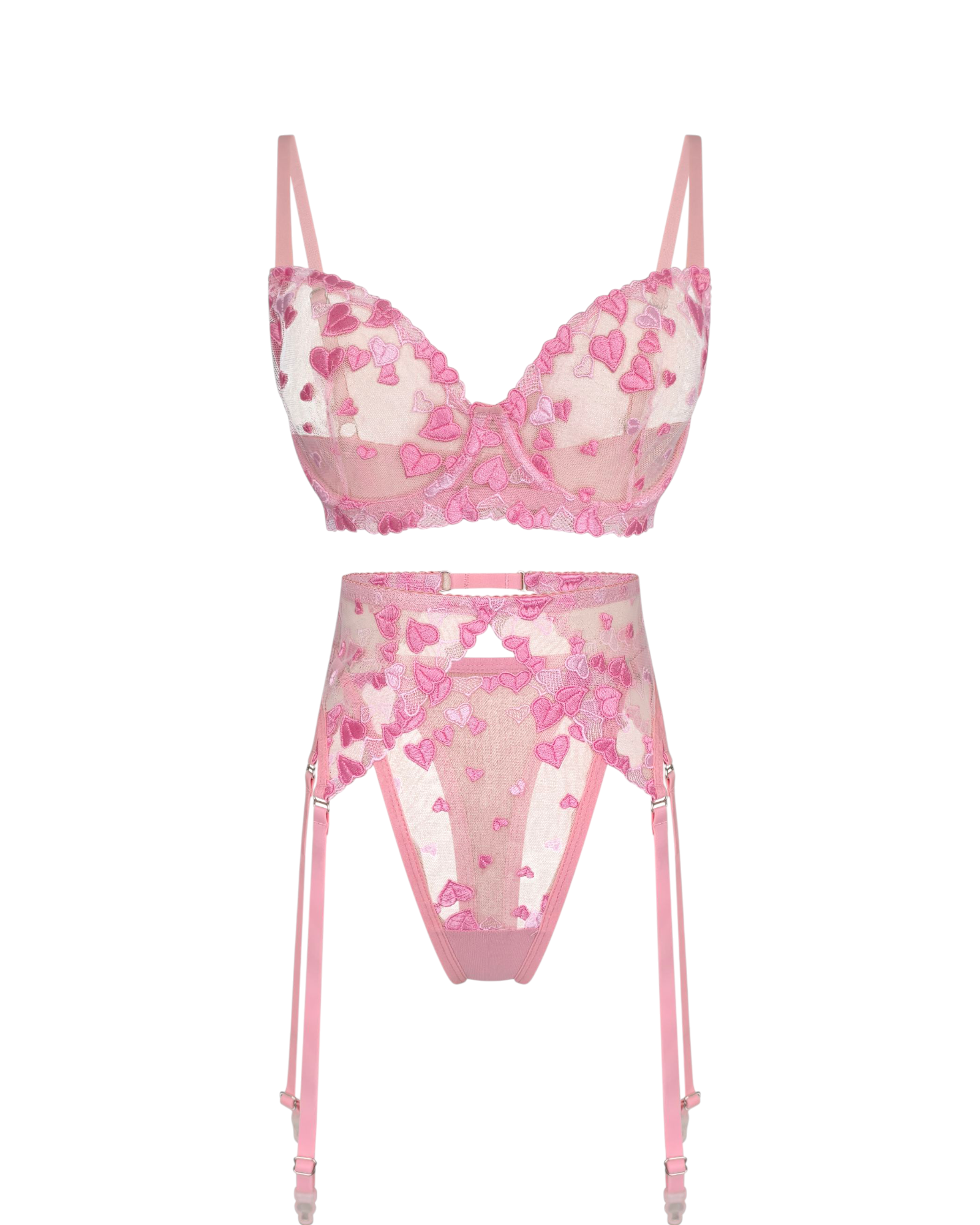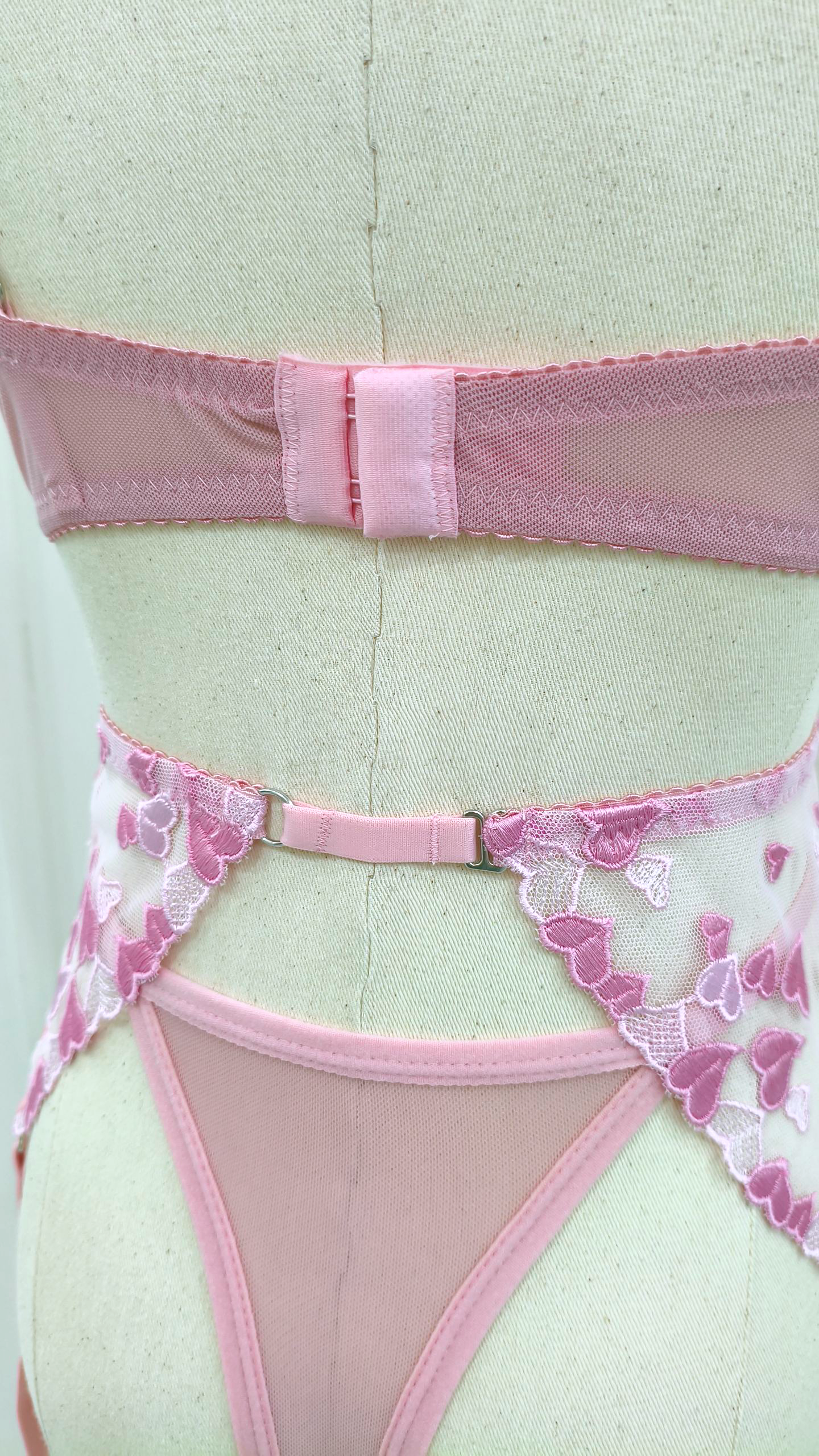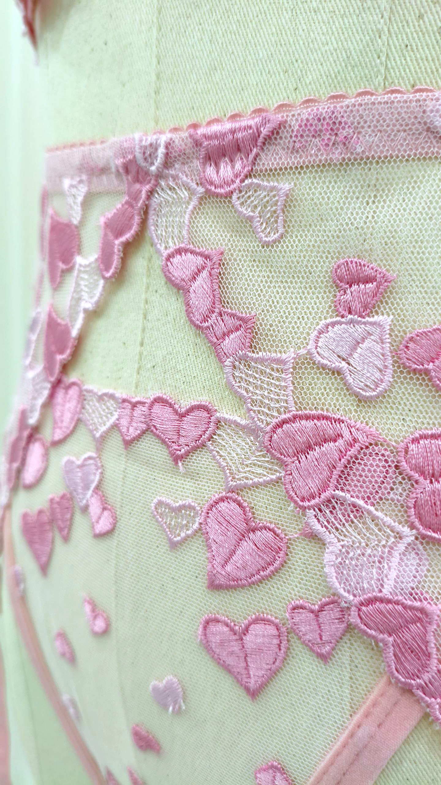 Sur une base de tulle finement brodé de petits coeurs aux douces nuances de roses poudré, le décolleté embellit la silhouette d'une touche de romantisme.