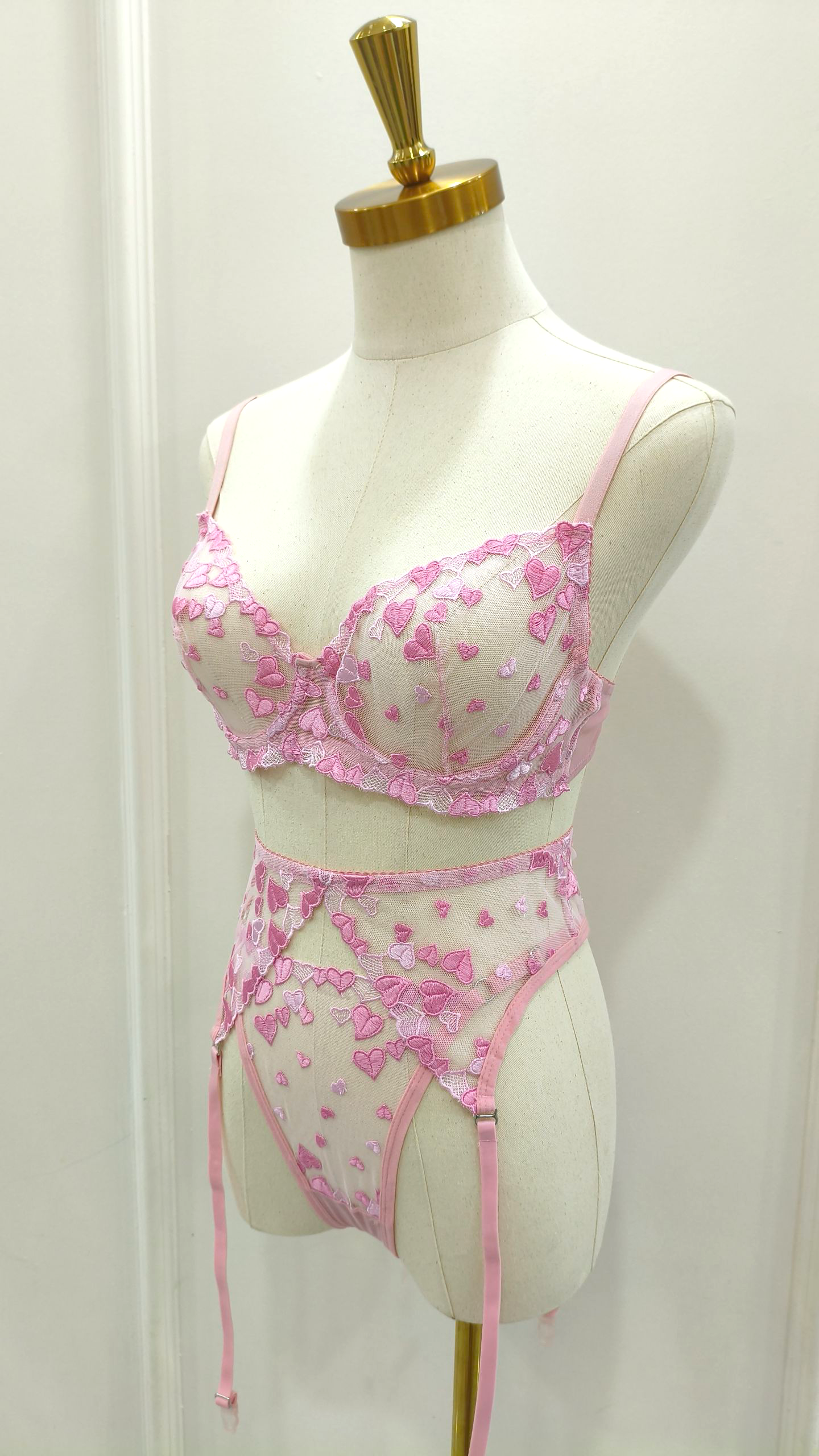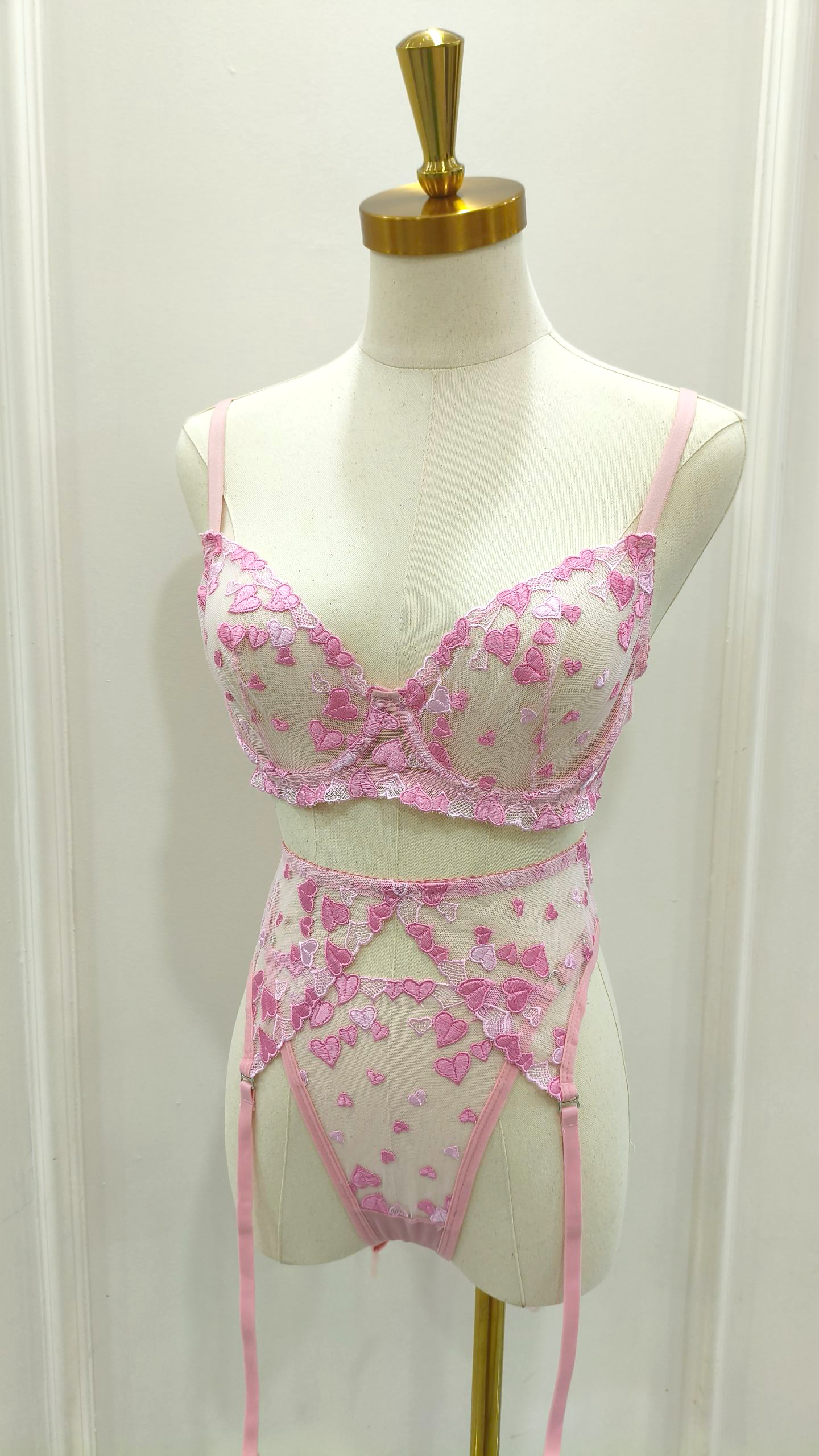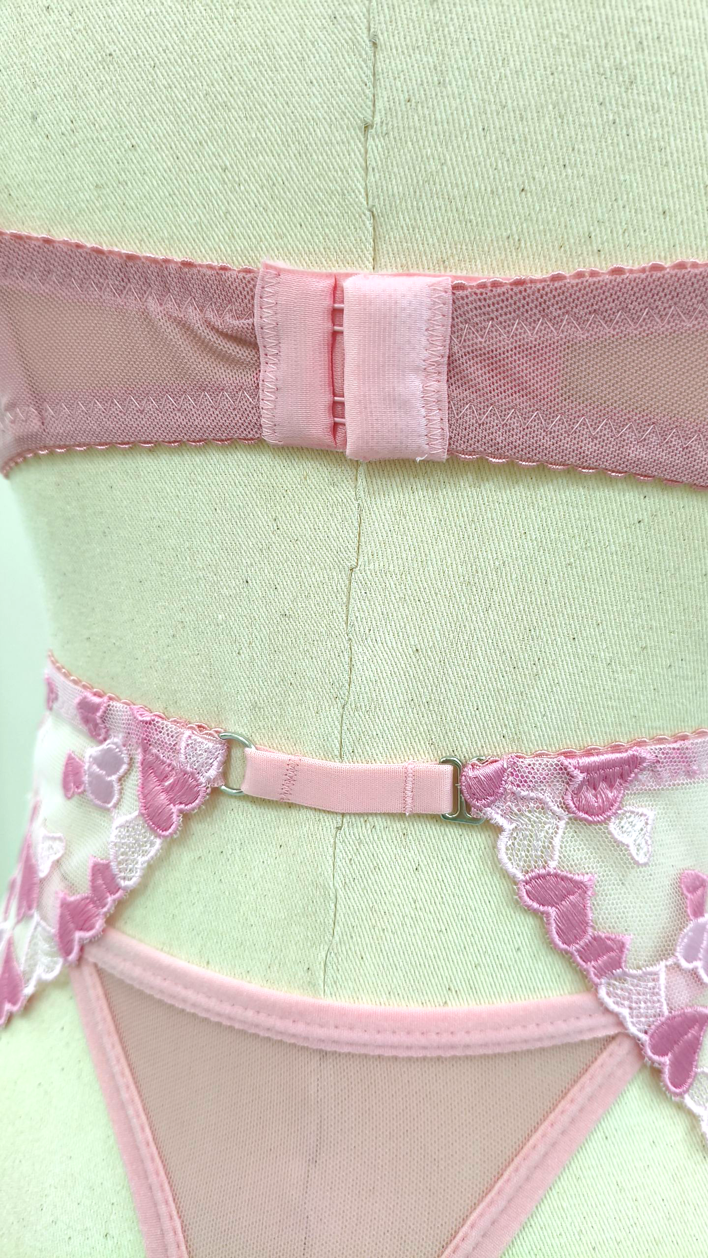 Sur une base de tulle finement brodé de petits coeurs aux douces nuances de roses poudré, le décolleté embellit la silhouette d'une touche de romantisme.