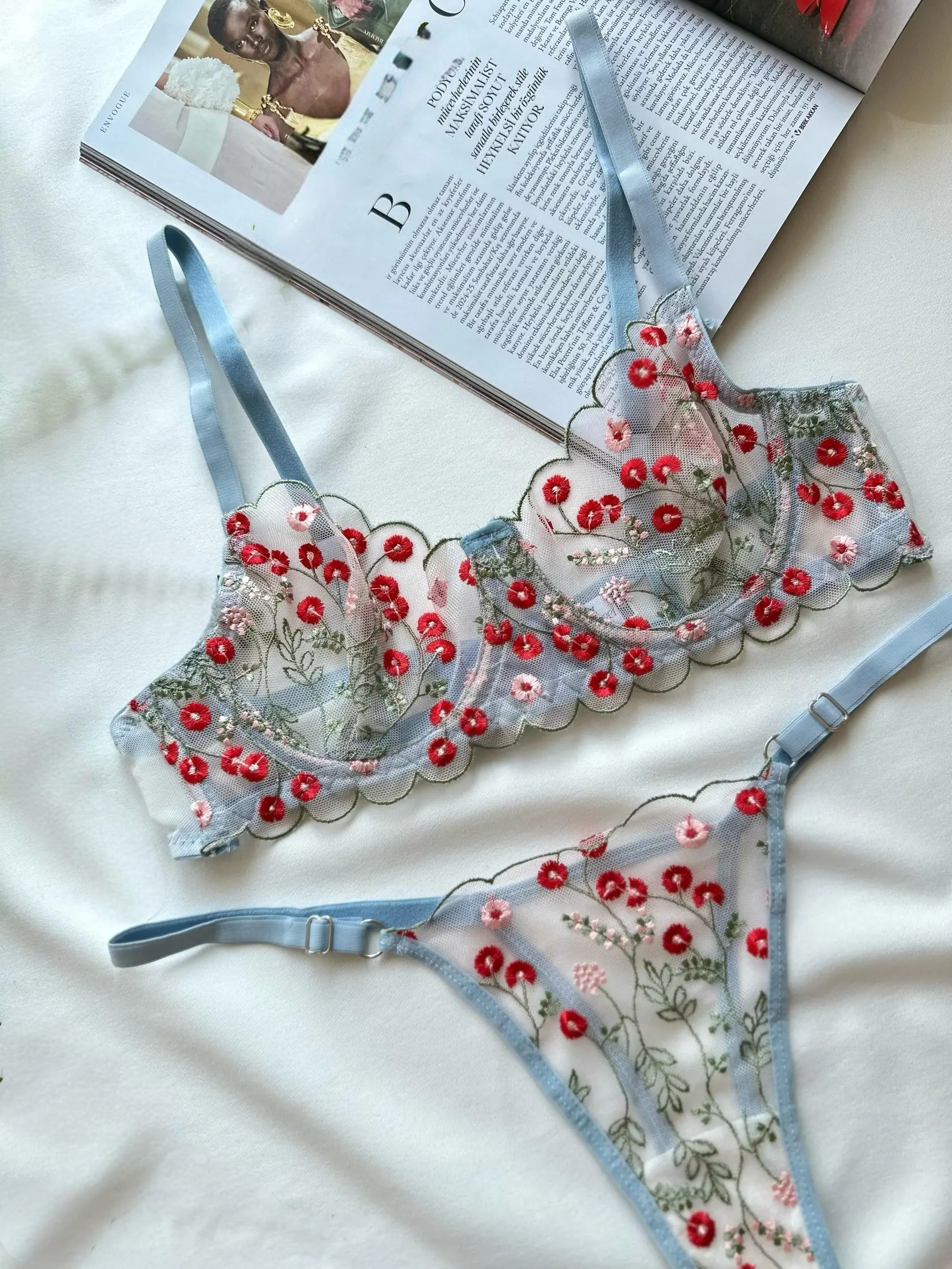 Broderies florales rouge passion contrastant sublimement avec le tulle crème
