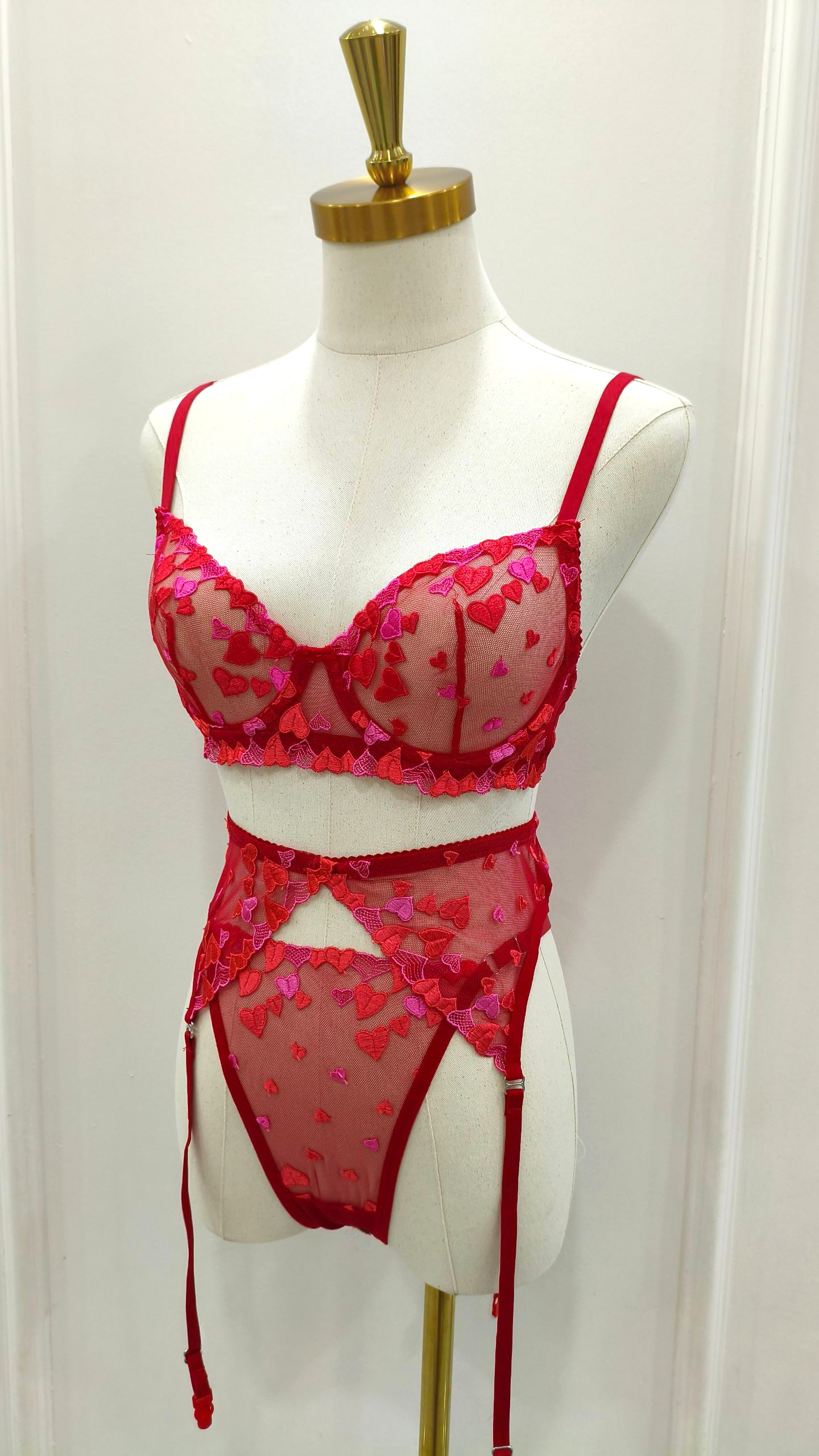 Un ensemble minion en tulle brodé orné de petits coeurs rouges et roses fushia, une pièce au style recherché toutefois idéal pour la vie quotidienne. Doté d'armatures pour assurer une esthétique impeccable et irrésistible, convient à toutes les morphologies.