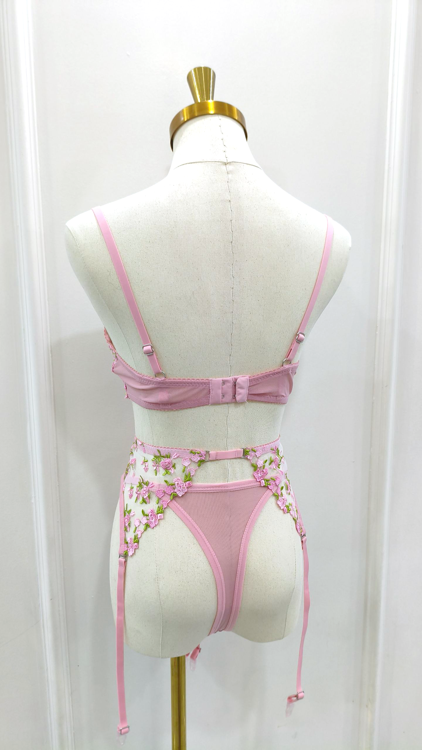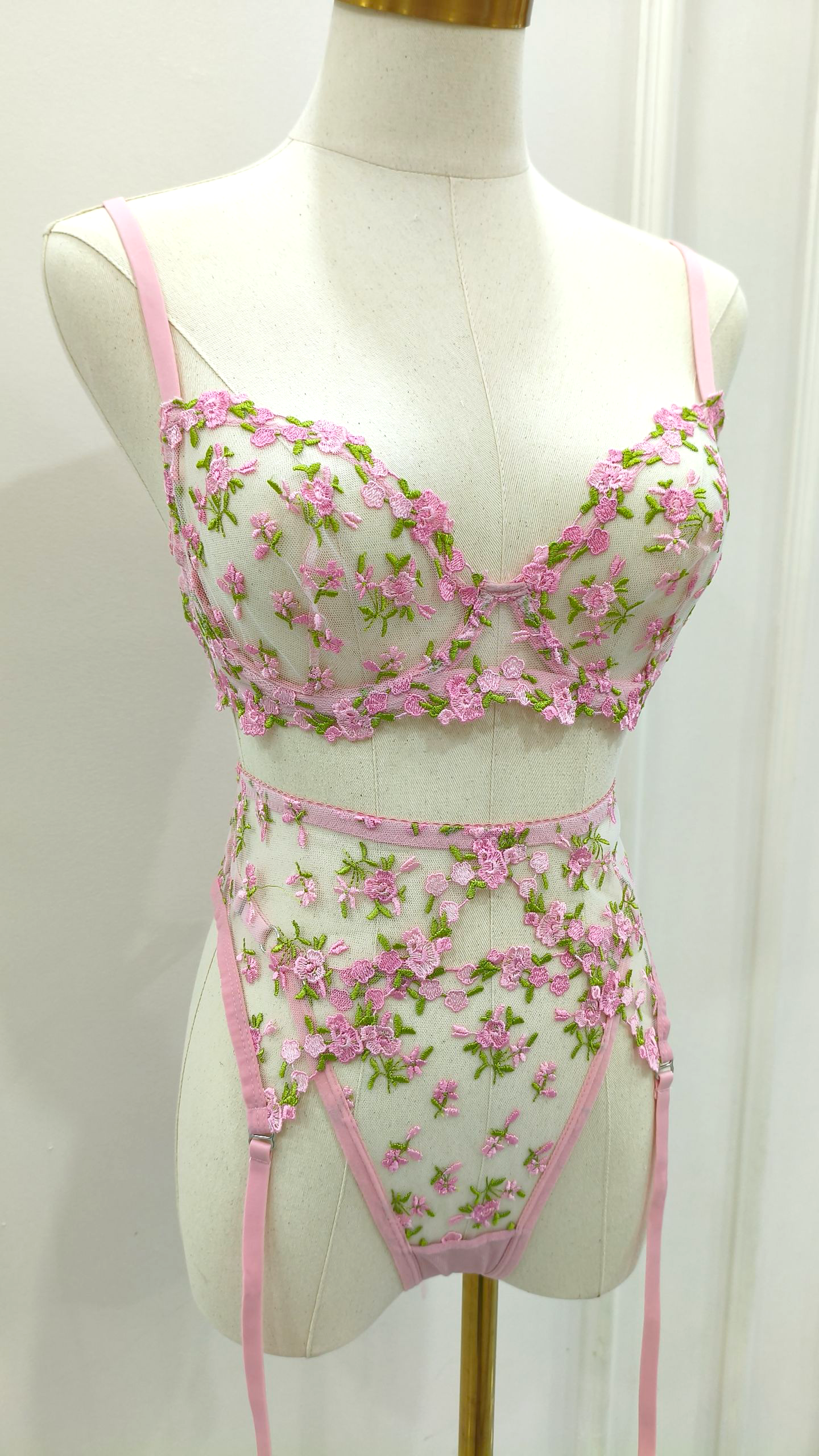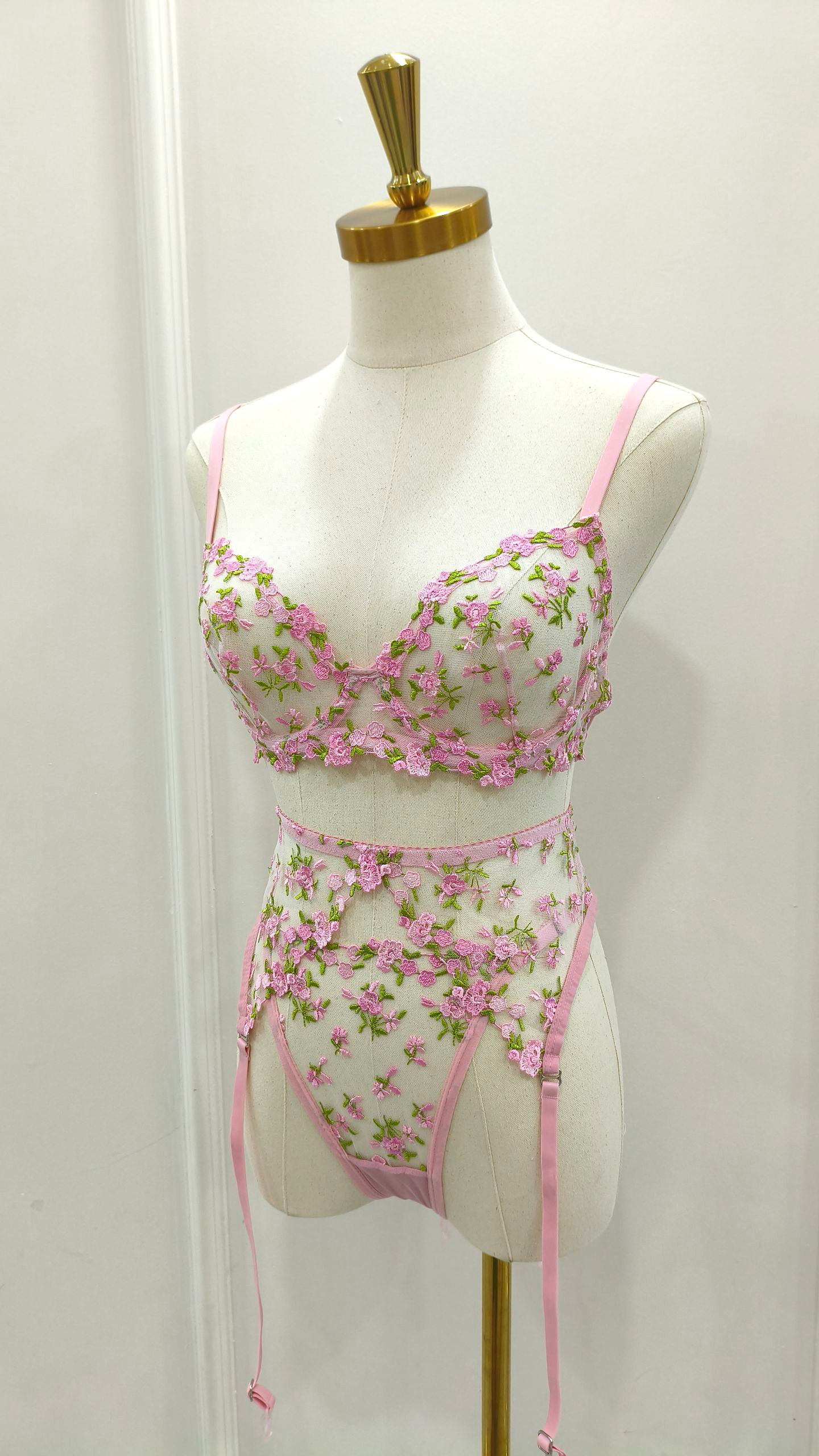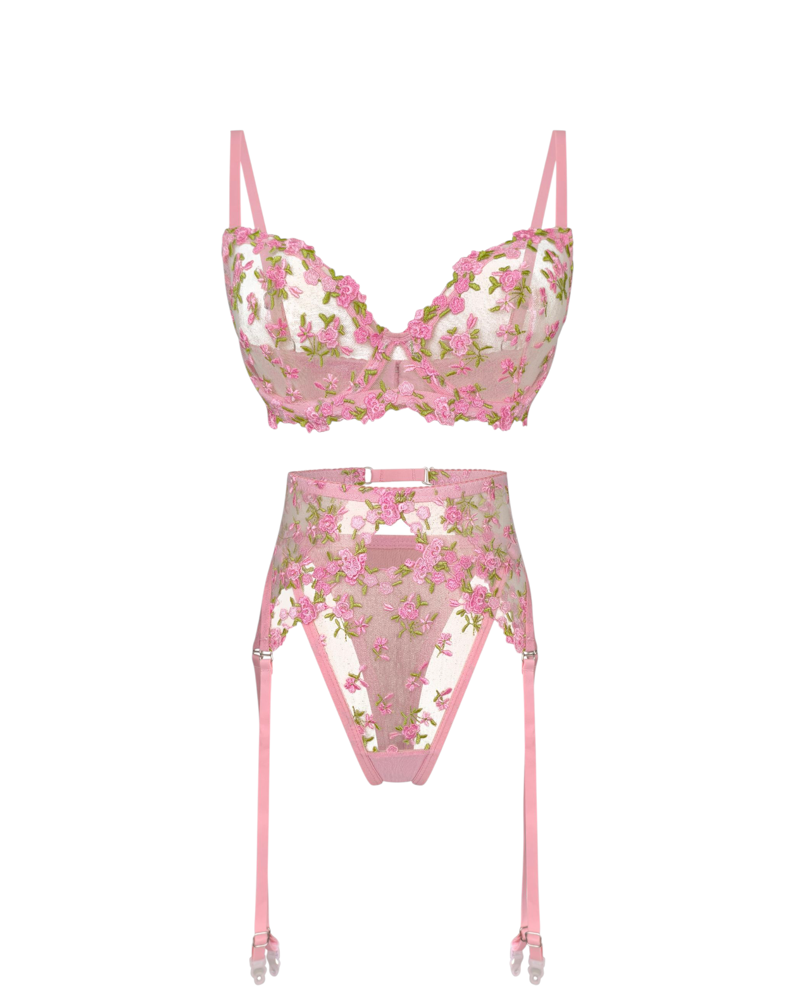 Un ensemble d'inspiration à la foi poetique et très bohème en tulles brodé de petite fleures roses et de bourgeons tel un beau jardin d'été. Ses armatures apportent un excellent soutien et ses bonnets souples sans coussinets allient confort et sensualité.