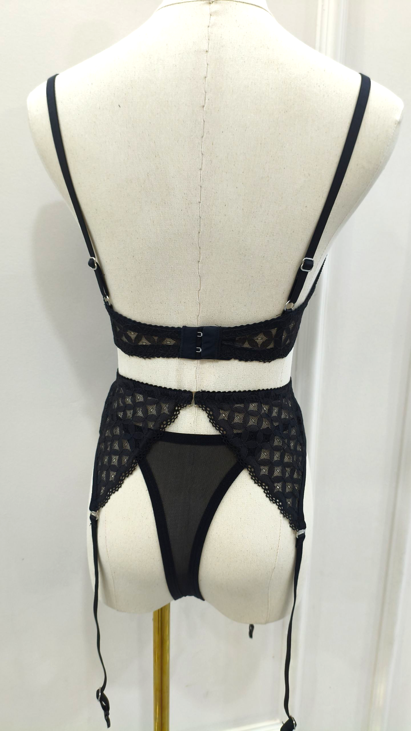 Entre subtilité et séduction, cet ensemble 4 pièces à l'allure très graphique est l'atout séduction de votre garde robe. De sa dentelle ajourée qui habille les courbes de sensualité, il crée un jeu subtil entre élégance et désir.
